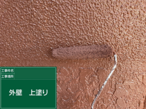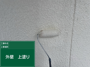 上塗り作業では、外壁の凹凸模様を活かしながら、塗りムラが出ないようローラーの動かし方や塗料の含み具合を細かく調整し、均一に仕上げています。