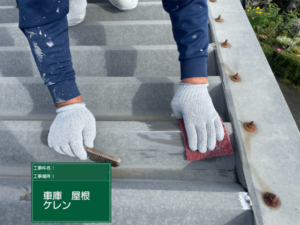 屋根も外壁も金属製のため、塗装前に入念にケレン作業を行います。