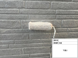 使用塗料は「ホワイトフィラー」下塗りは外壁の微細なひび割れや凹凸を整え、上塗り材との密着性を高めるための重要な工程です。